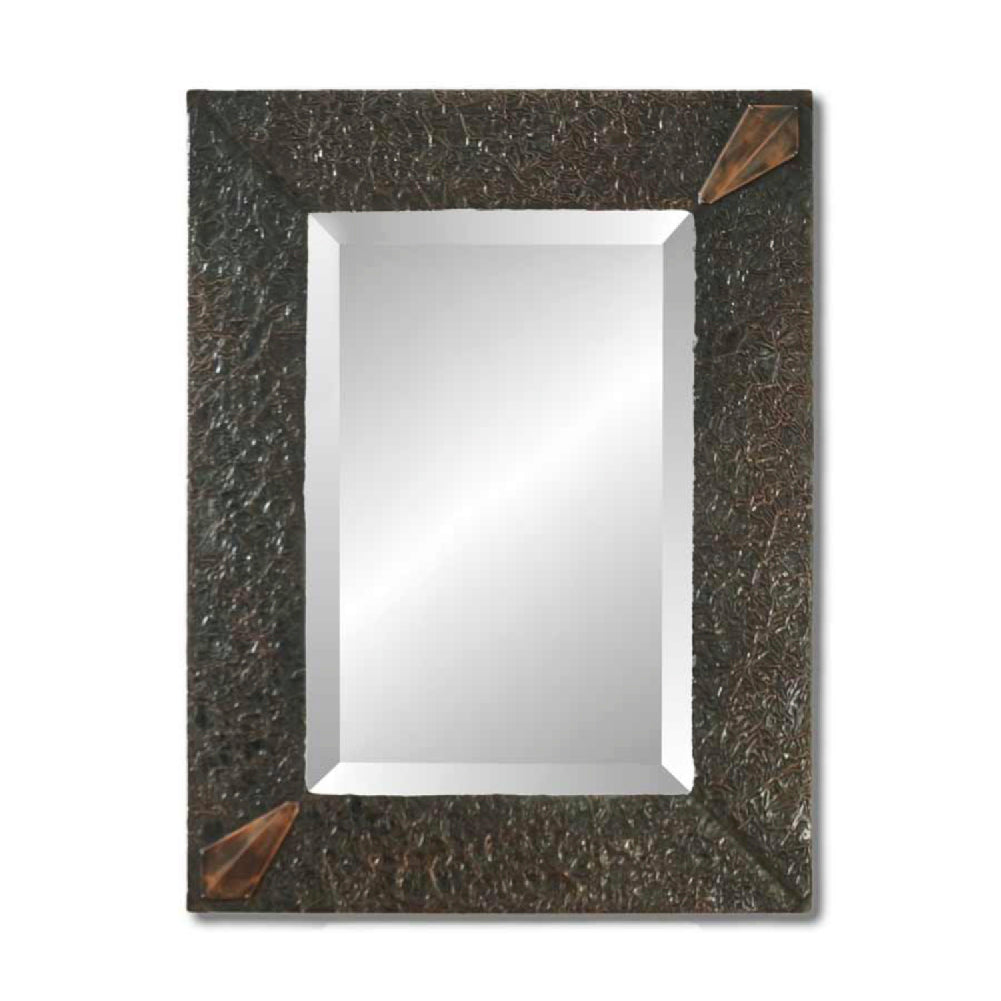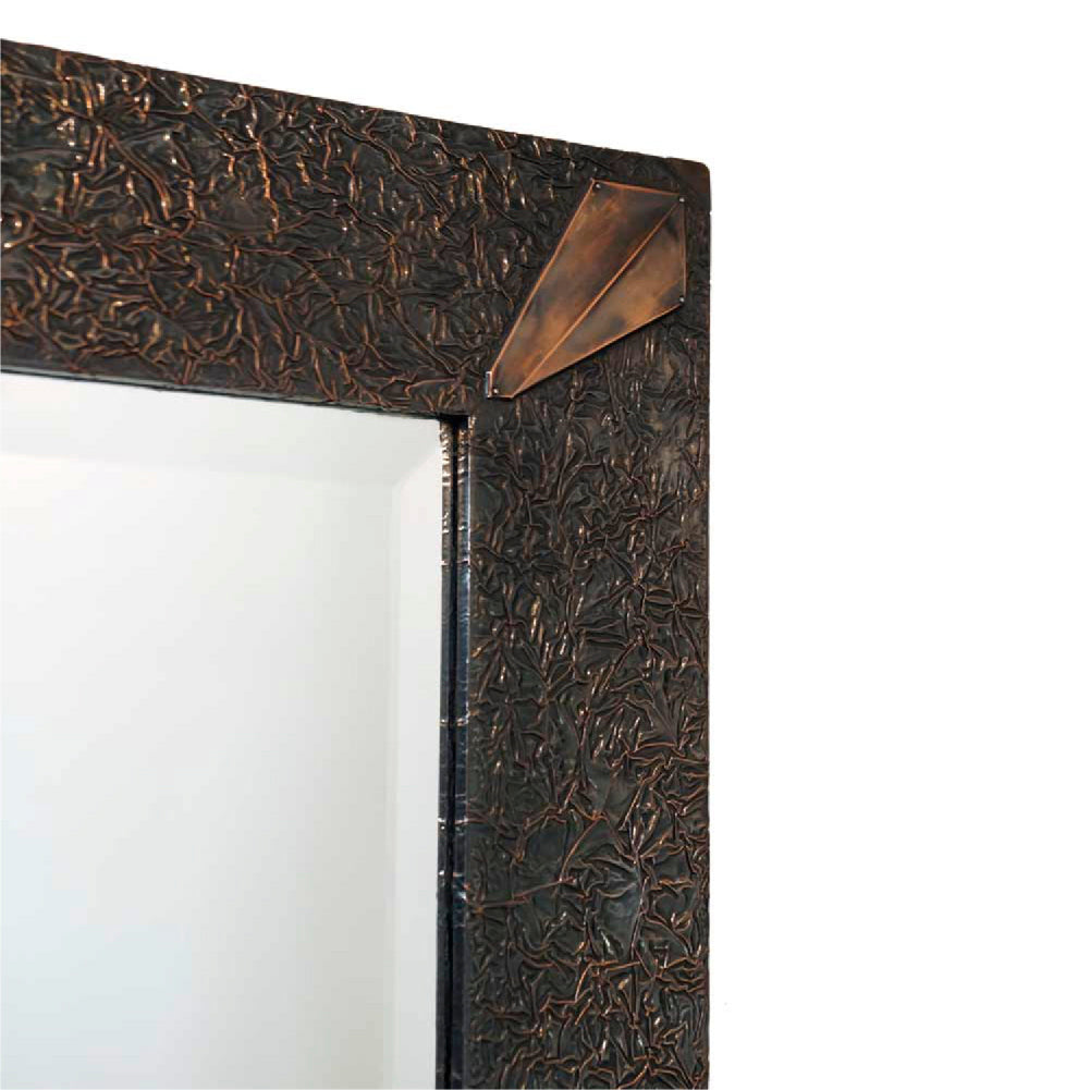 This breathtaking CRINKLED mirror combines the rich dark textured background of burnished copper, highlighted with 2 diamond-shaped inserts hand crafted of polished copper.