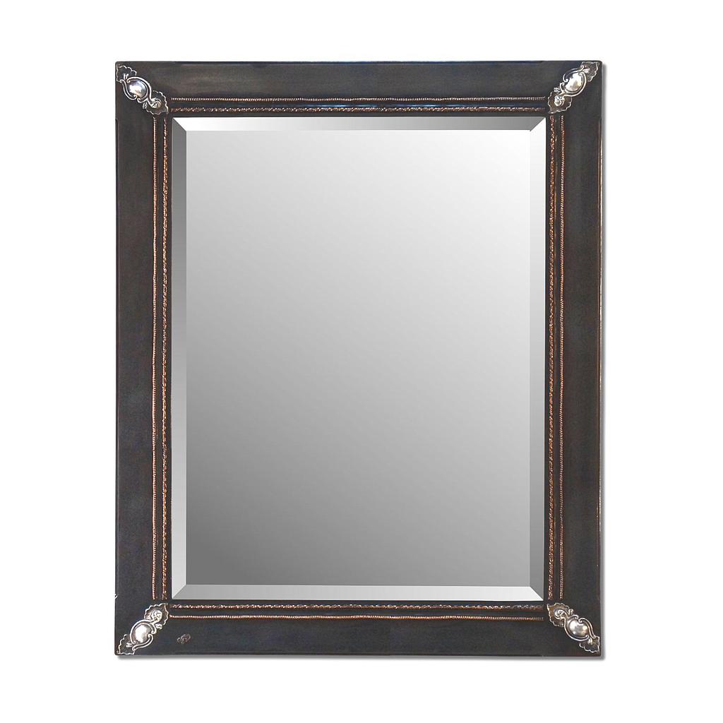 The frame of rich dark burnished copper is highlighted by the brilliant silver accents in the corners, and features a thick beveled glass mirror.